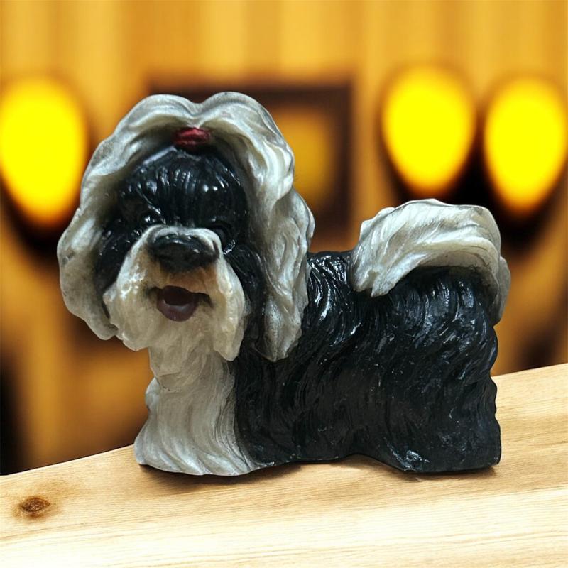 Це фігурка собаки ши-тцу. Фігурка зображує собаку породи ши-тцу чорно-білого забарвлення. Вона має деталізовану текстуру шерсті та червону стрічку на голові.