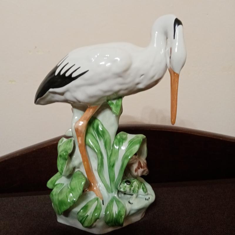 Красивая фарфоровая статуэтка, изображающая чаплю. Изделие выполнено в детализированом стиле с использованием зеленых листьев и коричневых акцентов. Статуэтка может стать прекрасным декоративным элементом в вашем доме или офисе. В идеальном состоянии. Без сколов и трещин.