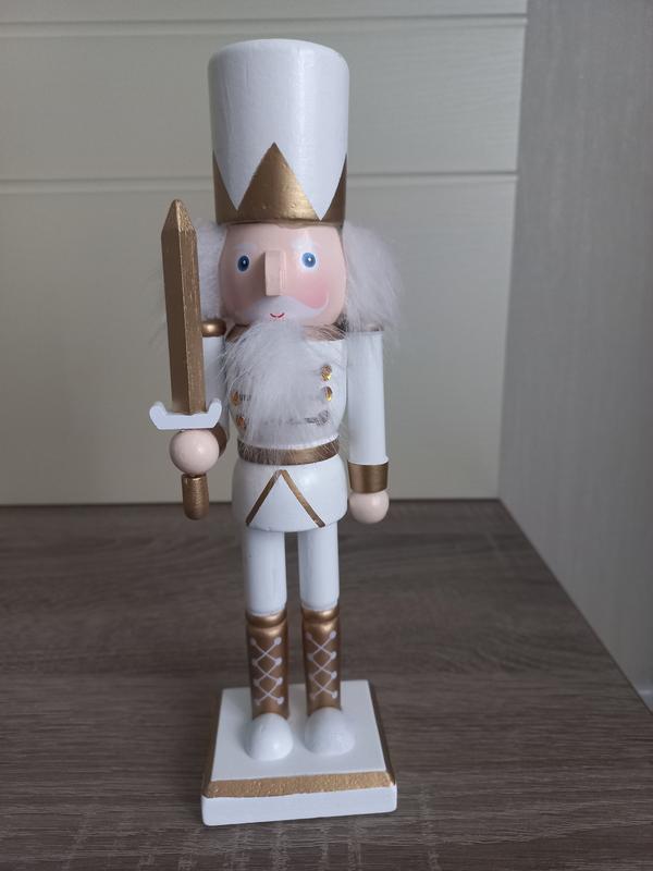 Біла різдвяна статуетка у вигляді лускунчика із золотими деталями. - НОВАЯ Статуетка виготовлена з дерева та має простий і класичний вигляд. Шир.7 x Довж.6 x Вис.25 см Доставка: - Отправлю Укрпочтой/ Новой почтой за счет покупателя после 100% оплаты на карту Приватбанка. Возврат и обмен не предусмотрен. - На автоматическую кнопку КУПИТЬ реагирую только после оплаты