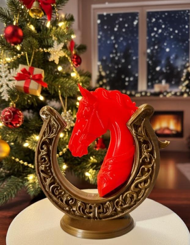 Декоративна фігурка Червоний кінь в підкові — компактна скульптура з PLA пластику в кольорах бронза і червоний, що символізує 2026 рік. Поєднання динамічної форми коня і класичної підкови створює образ сили, удачі та святкового акценту для інтер’єру. --- Технічні характеристики - Розміри: 14 см × 14 см × 6 см. - Матеріал: PLA пластик. - Кольори: бронзовий фініш на підкові; насичений червоний на фігурі коня. - Конструкція: монолітна модель; стійка підставка для надійного розміщення. --- Дизайн і символіка - Образ: кінь у динамічній позі всередині підкови, що поєднує енергію руху і традиційний символ удачі. - Деталі: рельєфні елементи на підкові, плавні лінії гриви і хвоста, чітка межа між бронзовою підковою і червоною фігурою. - Символіка: червоний колір асоціюється зі святковістю і енергією; підкова — як оберіг і символ вдачі на рік. --- Використання і догляд - Призначення: інтер’єрна статуетка, святковий декор, подарунок‑талисман на Новий рік. - Розміщення: полиця, камінна полиця, столик, вітрина. - Догляд: протирати м’якою сухою або злегка вологою тканиною; уникати агресивних розчинників і тривалого впливу прямих сонячних променів. - Безпека: не ставити поруч з відкритим вогнем; при зовнішньому використанні захищати від вологи.