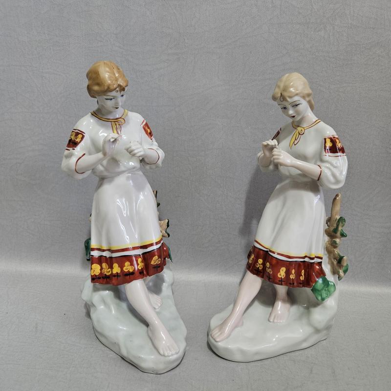 Фарфоровая статуэтка в вышиванке, изображенная на картинке, известна как «Ворожение на ромашке» или «Любит — не любит». Она была изготовлена на Полонском заводе художественной керамики (ПЗХК или ZHK Polonne) в Украине во времена СССР, вероятно, в 1960-х или 1970-х годах. Фигурка выполнена из глазурованного фарфора и росписи вручную, отражая сельский украинский народный стиль. Она изображает девушку в традиционном украинском наряде, которая гадает на лепестках ромашки, чтобы узнать о своей любви. Эта статуэтка является популярным предметом коллекционирования советского периода. высота 28 см, состояние новое, цена 1 шт - 1000 грн