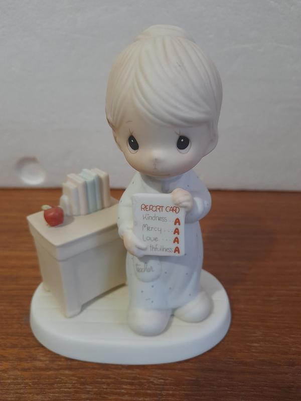 h 15 cm Это винтажная керамическая фигурка Precious Moments "Love Never Fails" (Любовь никогда не подводит), выпущенная в 1984 году. На фигурке изображен ребенок, держащий табель успеваемости с оценками «А» по предметам: «Доброта», «Милосердие», «Любовь» и «Верность». Фигурка относится к коллекционным предметам, которые могут иметь ценность, особенно если они находятся в хорошем состоянии и имеют ранние маркировки. Маркировка на дне фигурки указывает год ее производства, что является ключевым фактором для коллекционеров. Оригинальные фигурки Jonathan & David (предшественники Precious Moments) или те, что были выпущены ограниченным тиражом, могут стоить дороже.