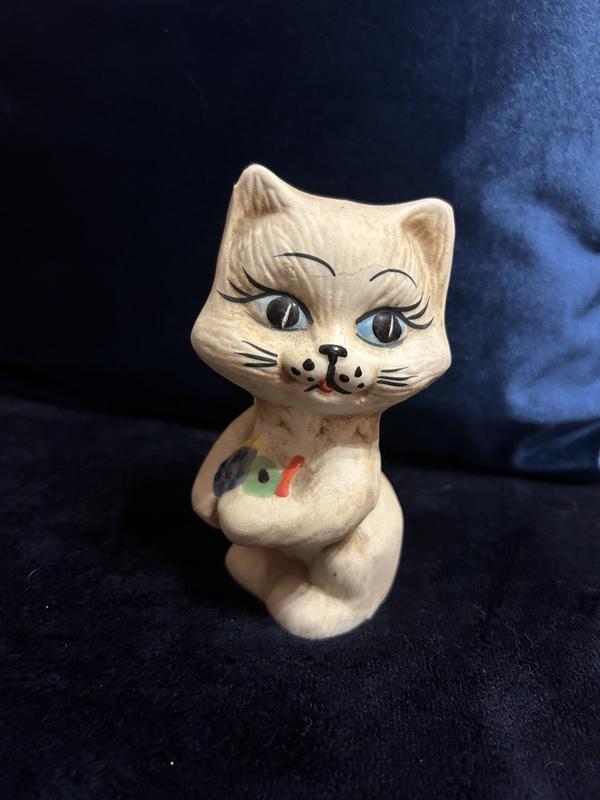Вінтажна статуетка котика із іграшками. Фігурка привертає увагу своїм кокетливим поглядом, довгими віями та милою мордочкою. Виріб має приємну матову фактуру та збережений розпис, що додає йому особливої автентичності. Завдяки компактному розміру цей котик ідеально прикрасить поличку або робочу зону.