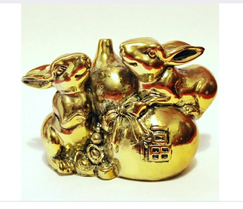 Статуэтка "Золотые зайцы с тыквой горлянкой". Материал-полистоун.Цвет-золото.Размер-11×7 см. 🧧Это добрый символ, означающий изобилие, долголетие, сочувствие и зарождение чего-то нового. Заяц 🐇— одно из животных китайского лунного календаря, он считается покровителем этого календаря, способным принести долголетие и успех своему обладателю. Старая легенда гласит, что заяц принес себя в жертву, чтобы накормить Будду, за это Будда поселил его на луне и наделил волшебными способностями исцелять и приносить удачу🍀. Значение кролика по фен-шуй можно еще определить как “плодовитость” и “счастье в семейной жизни”. Так как в реальности кролики достаточно любвеобильны и плодовиты, их фигурки и изображения символически воздействуют на нашу жизнь тоже. Так, вам стоит обзавестись фигуркой зайца, если хотите иметь здоровое потомство. Тыква горлянка-символ долголетия и крепкого здоровья. Цена снижена вдвое в связи с закрытием магазина. Отправка Укрпочтой и Новой почтой.