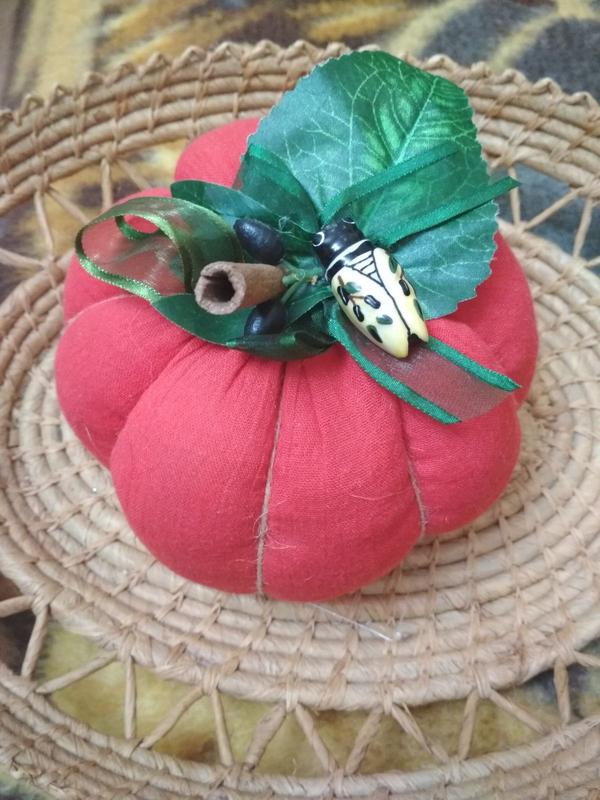 Статуэтка тыковка-хороший осенний сувенир,может стать оригинальным подарком.Использовать можно и как игольницу.Выполнена из хб ткани,украшена палочкой корицы и разными забавными аксессуарами.Размер 14*18 см.