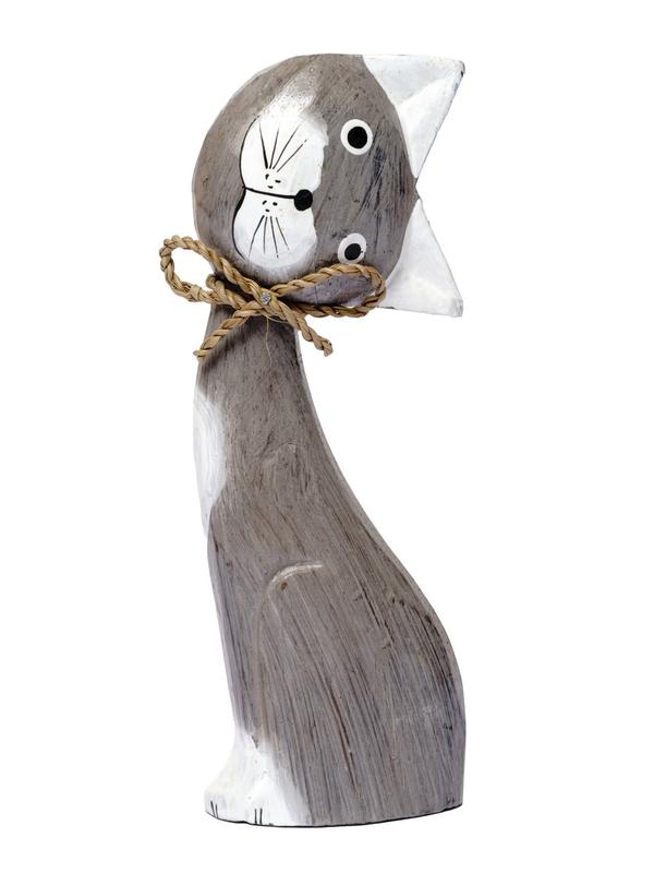 Кіт або кицька,їх шанують як берегинь домашнього вогнища,приносять у дім,добробут і спокій. Грайлива кішечка,голова на бік,висота 16 см.Матеріал - дерево бальса.Колір - сірий,w/w.Країна виробник - Індонезія,ручна робота.