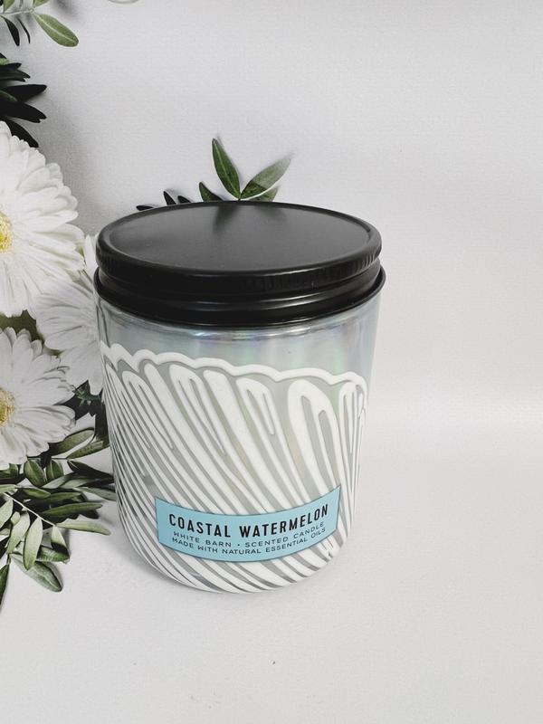 💞Ароматична свічка Coastal watermelon від Bath and body works 🕯 🌺Виготовлена з ексклюзивної суміші соєвого воску і натуральних ефірних олій найвищої концентрації - безперервно і рівномірно тане, випромінюючи досить аромату щоб заповнити всю кімнату, при горінні не коптить, завдяки фитилю з натурального матеріалу та якісної суміші рослинного воску - в незапаленому вигляді можна використовувати як освіжувач або ароматизатор для невеликих приміщень, ванної кімнати, вбиральні та ін - дуже гарне оформлення, скляна банка з наклейкою і кришка виглядають разом дуже затишно і стильно, цією свічкою можна чудово прикрасити інтер'єр - Має 1 гнот 💦Композиція аромату: освіжаюча, солодка суміш соковитого кавуна, щіпки рожевої морської солі і океанських хвиль