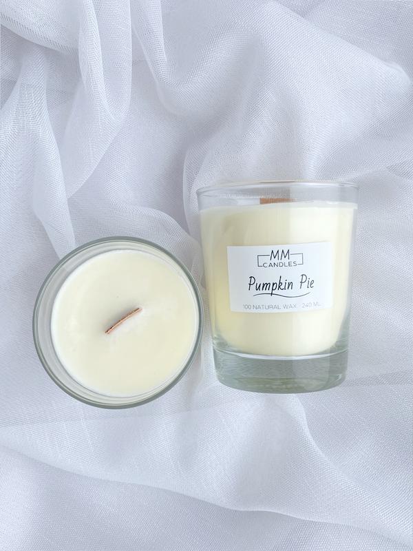 Pumpkin pie - свічка з ароматом пряного гарбузового пирога. Затишна та тепла композиція із шлейфом вершкової ванілі. Верхні ноти: коричневий цукор, цедра лимона та ігристий імбир. Середні ноти: цукровий гарбуз, кориця, гвоздика Базові ноти: ваніль, шафран, кленовий та масляний крем Склад: 100% соєвий віск Об'єм свічки: 180, 200, 240 мл. Приблизний час горіння: 50 годин Упакована в подарункову коробочку, ідеально підійде на подарунок!