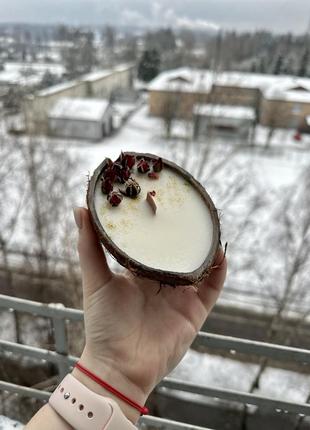 Свеча в кокосе. Кокос настоящий. Декор и аромат может быть разный. Древесный гнет, который при горении потрескивает. Также может быть хлопковый угнетение.