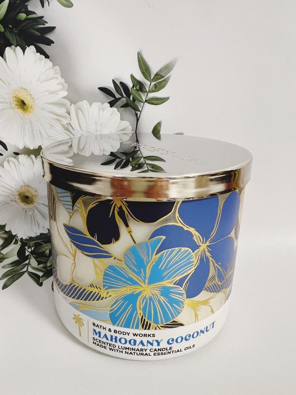 💞Ароматична свічка Mahogany coconut від Bath and body works 🕯 🌺Виготовлена з ексклюзивної суміші соєвого воску і натуральних ефірних олій найвищої концентрації - безперервно і рівномірно тане, випромінюючи досить аромату щоб заповнити всю кімнату, при горінні не коптить, завдяки фитилю з натурального матеріалу та якісної суміші рослинного воску - розрахована на 25-45 годин безперервного горіння - в незапаленому вигляді можна використовувати як освіжувач або ароматизатор для невеликих приміщень, ванної кімнати, вбиральні та ін - дуже гарне оформлення, скляна банка з наклейкою і кришка виглядають разом дуже затишно і стильно, цією свічкою можна чудово прикрасити інтер'єр - Має 3 гнота 💦Композиція аромату: крем кокос, червоне дерево, англійська лаванда з натуральною ефірною олією