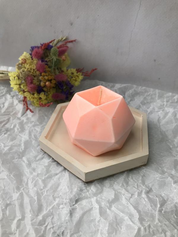 Яркий набор 🧡 Свічка “3d” Соевый воск Вес 90 г Высота 4,5 см Ширина 6 см Время горения ~ 4-5 часов Аромат апельсин Подставка “Шестиугольник” Гипс Вес 90 г Размер 11,5*11,5 Высота 1,3 см На подставке специальное покрытие, для того чтобы подставка не царапала поверхность мебели. Цена набора 250 грн