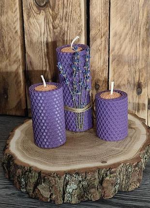 Набор из трех свечей. Свечи двухцветные, середина цвета топленого молока, снаружи нежного лавандового цвета. Также возможен вариант, когда свеча среднего размера внутри цвета лаванды, а снаружи цвет топленое молоко, на фото можно увидеть эти варианты. Размеры свечей: 12, 8 и 6 см высота и 4,5 см диаметр. Изготовлены из воса, имеют очень приятный аромат меда и воска. Упакованы в подарочную коробку.