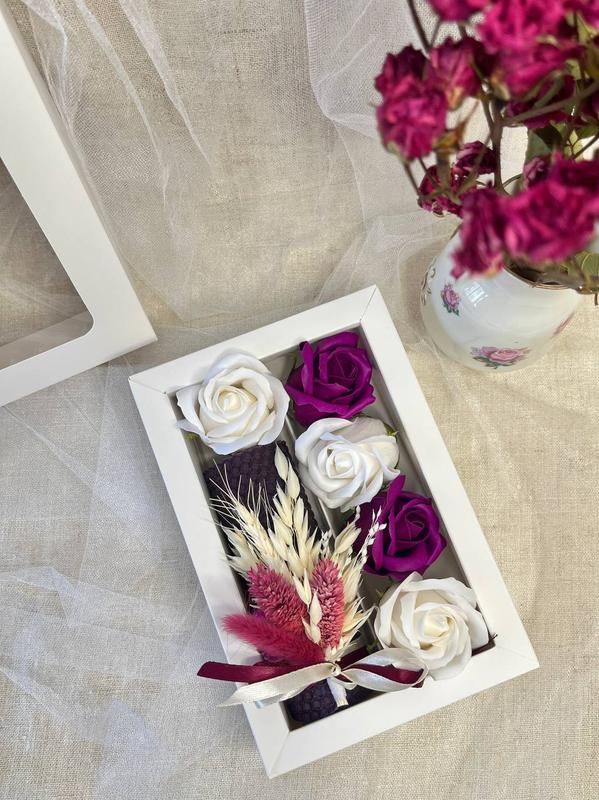 ### Впечатляйте с нашим элегантным подарочным набором! В подарочный набор входит: - свеча ручной работы из медовой вощины высотой 13 см и диаметром 4,5 см. Свеча декорирована сухоцветами. - мыльные розы в количестве 5 штук, поражающих своей красотой. Этот набор - идеальный способ сделать особый момент еще более прекрасным. Преобладающий цвет подарочного набора - баклажан. ###