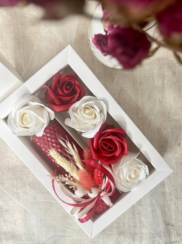 Вражайте з нашим елегантним подарунковим набором! У подарунковий набір входить: - свічка ручної роботи з медової вощини висотою 13 см і діаметром 4,5 см. Свічка декорована сухоцвітами. - мильні троянди у кількості 5 штук, що вражають своєю красою. Цей набір - ідеальний спосіб зробити особливий момент ще прекраснішим.