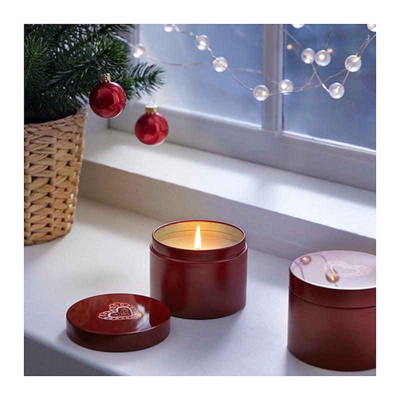 Аромасвеча в подарочной жестяной банке ИКЕА Приятный и свежий аромат корицы и сахара. Когда вы зажигаете эту свечу, по комнате распространяется рождественский аромат корицы и сахара. А после того, как свеча довернется, вы можете использовать красную металлическую банку для мелочей, которые обычно так легко теряются. Размер Высота: 6 см Диаметр: 8,5 см Время горения: 20 ч Цена - 250 грн.