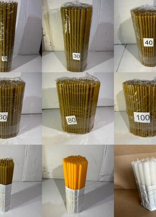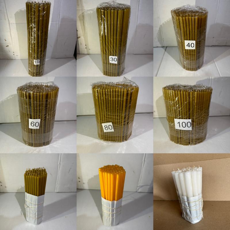 Свічки церковні з парафіну власного виробництва. В упаковці по 2кг. Ціна - 310. Опт-290грн №10 - В-40см. Д-14.5мм №30 - В-30см. Д-9.5мм №40 - В-25см. Д-8мм №60 - В-21см. Д-7.5мм №80 - В-18см. Д-6.5мм №100 - В-17см. Д-6мм Також є №80 по 0.5кг. Ціна - 90грн. Опт-85грн Є під замовлення воскові свічки всіх розмірів Свічка парафінова біла власного виробництва. Не димить та не тече. В пачці 20шт. Діаметр - 18мм. Висота - 18см Ціна за пачку - 130грн. Опт від 10 пачок - 115грн