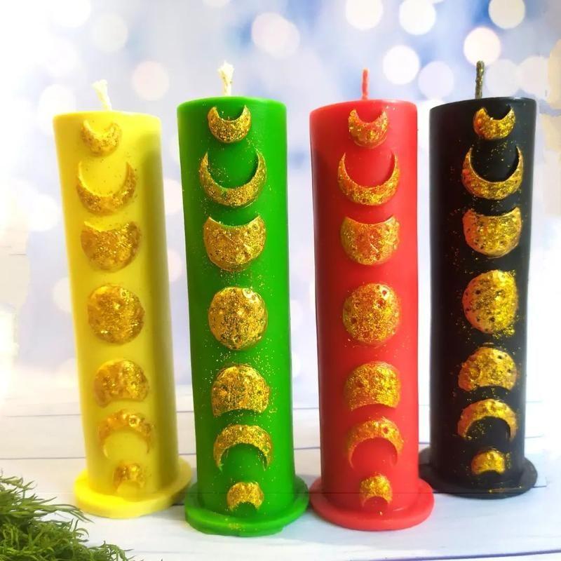 ВІВТАРНА СВІЧКА "ФАЗИ МІСЯЦЯ "🌖🌕🌔 Може використовуватися багаторазово. Кольори чорна, червона , зелена,світло жовта. 🌑Молодик - Прекрасний час для початку нових проектів: початку нових відносин, початку сімейного життя, отримання нової роботи, а також для всіх магічних практик, пов'язаних з цими областями. 🌖Зростаюча Місяць - Час для руху до наміченої мети, до досягнення планів, до процвітання. У цей період краще всього працює магія, спрямована на збільшення (благополуччя, здоров'я, грошей і т.д.) 🌕Повний Місяць - В цей період Місяць знаходиться на вершині своєї влади. Це час дуже сприятливо для магії, так як Місяць має найбільшу силу. Можна використовувати цю силу для будь-якої своєї мети, але особливо сильно цей час для зв'язку зі світом духів, для любові і екстрасенсорною енергії. 🌔Спадаючий Місяць - Ідеальний час для магії руйнування. У цей період необхідно позбавлятися від різних непотрібних речей. Магія може бути спрямована на зникнення шкідливих звичок, поганих відносин і всього непотрібного. Також можна робити енергетичну чистку приміщень і організму. Розмір :висота 13 см, діаметр 3,5 см, вага 140 г