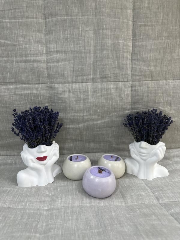 Свечи изготовлены из соевого воска с эфирным маслом лаванды. Время горения маленькой свечи 5 часов. Время горения средней свечи +- 12 часов. Такая свеча подарит легкий лавандовый аромат и приятную атмосферу. Размеры: Маленькая - 70ГРН Средняя - 170грн