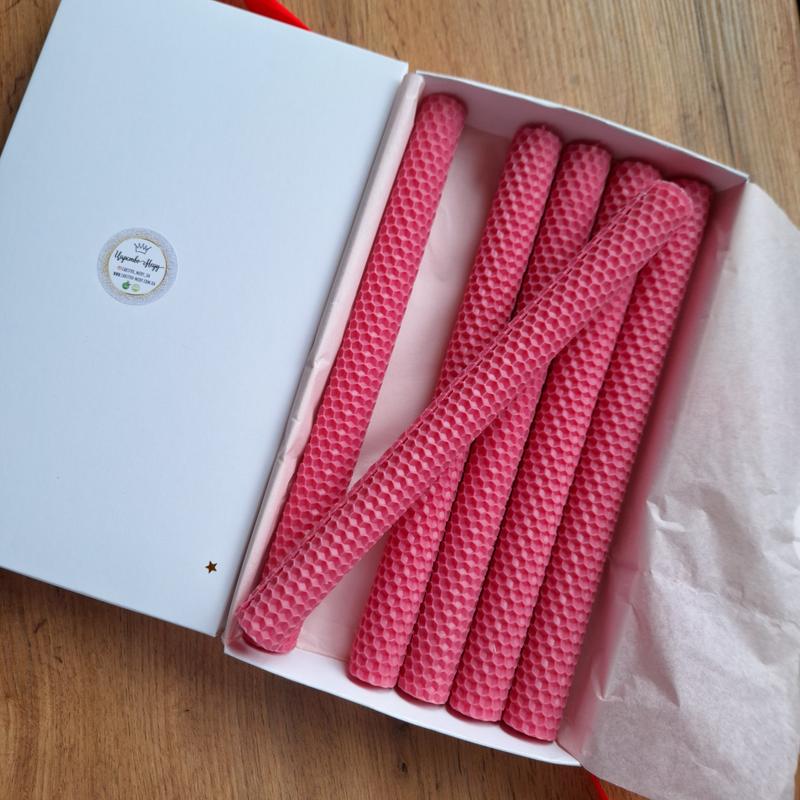 Набор свечей с вощины в подарочной коробке с атласной лентой. Свечи ручной работы, сделанные из цветной вощины, высотой 26 см. В наборе тонких свечей, диаметром 3 см. Благодаря тому, что свечи изготовлены из натурального пчелиного воска, Вы можете использовать их в закрытых помещениях, не опасаясь за свое здоровье. Размер 27*16 см