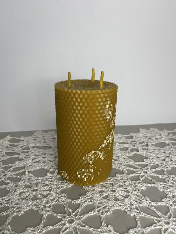 Свеча ручной работы, созданная из вощины жёлтого цвета. Её высота 13 см, а диаметр - 8 см. Кроме приятных ноток медового аромата, являющегося неотъемлемой составляющей свеч из вощины, в эту свечу добавлен ароматизатор "Ваниль". Нежно распространяющийся при горении аромат ванили создает атмосферу уюта и комфорта. Свеча поражает своей детализацией: поверхность свечи имеет характерный геометрический рисунок в форме сот, украшенная золотым поталем, что придает ей особый шарм. Золотистые узоры, как тонкие бусины, переплетаются на поверхности свечи, создавая впечатление роскоши и элегантности. Пламя свечи теплое и спокойное подарит вашему дому атмосферу уюта. Каждый элемент этой свечи - от ее формы до аромата и декора - создан с любовью к деталям, чтобы дарить вам мгновения неповторимой гармонии и покоя.