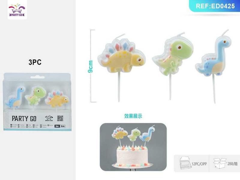 Набір свічок для торта "Динозаврики", 9 см. Різні кольори. 3 свічки в наборі. Матеріал - комбінований. Упаковка - пластикова коробка.
