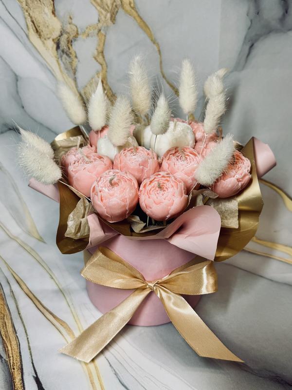 Композиція виконана з соєвого воску,приємний аромат (який вибираєте саме ви). В букеті 15 піонів,гіпсова підставка для запалювання свічки в подарунок.