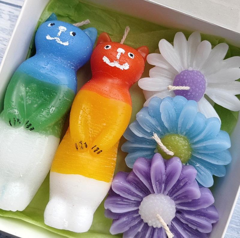 Яскравий набір свічок в кольорах Веселки, ручної роботи. Неординарний і в одночас корисний подарунок. Склад: 80% харчовий парафін П 2, + 20% пальмовий віск (для довшого і кращого горіння) Розмір подарункової коробки з прозорим віконцем 12*12 см.