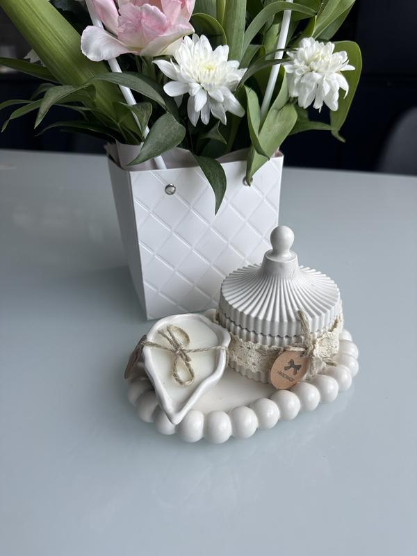 Набор свечей из соевого воска. В набор входит: Свеча шкатулка с крышкой ( соевый воск + древесныйпрясть, который трещит во время горения) Свеча ракушка ( соевый воск + хлопковый груз) Подставка гипсовая Кашпо изготовлено из гипса и обработано лаком. Набор может быть в цветах: Белый Серый Беж Полностью ручная работа.