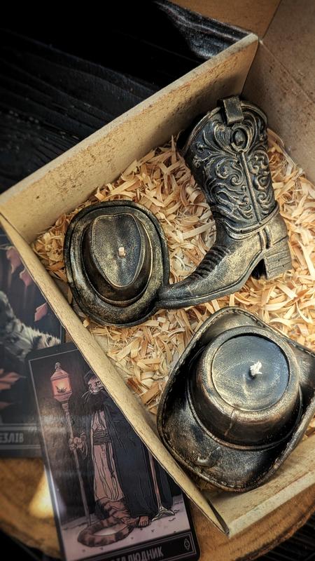 Набор свечей “Ковбойский закуток” Три свечи из пчелиного воска в образе ковбойских шляп и сапога, чтобы добавить к пространству немножко дикого мероприятия. Все – с винтажным эффектом, словно из фильма, который пахнет дымом и приключениями. Ручное литье, с любовью к деталям, чтобы каждый изгиб казалось настоящим. Безопасны для здоровья, пахнут чуточку свободой и немножко пылью дороги. Подходит для декора, тематических вечеринок или чтобы выразить восхищение внутреннему шерифу. Комплект, что говорит: "я видел пустыне — и оставил ее более красивой."