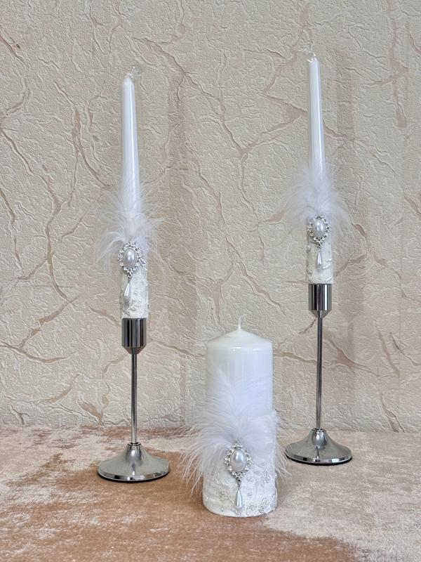 Свічки «Сімейне вогнище» з велюровими знімними чохлами — чарівна атмосфера весілля та тепла у вашому домі! Стильні свічки, які стануть ідеальним доповненням вашої весільної церемонії, а згодом принесуть затишок і тепло у ваше сімейне життя та дім. Особливості: • Весільний дизайн: Ніжне мереживо, легке пір’ячко, вишукана брошка та перлинки роблять ці свічки вишуканим аксесуаром для вашого особливого дня. • Велюрові знімні чохли: М’які на дотик велюрові чохли легко знімаються, що дає можливість використовувати свічки окремо у повсякденному житті. • Висока якість: Натуральний віск забезпечує чисте і тривале горіння. • Ідеальний розмір: Компактні, але достатньо великі, щоб створити романтичний настрій під час весілля і затишок вдома. • Ручна робота: Кожен елемент декору виконаний з любов’ю та увагою до деталей, що робить свічки унікальними. Розмір: 2 високі свічки по 24,5 см, 1 Матеріал: парафін, велюр, текстиль, декоративні елементи. Свічки «Сімейне вогнище» — це не просто декор, а символ тепла, любові і гармонії вашої сім’ї. Ціна: 1500₴