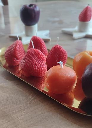 Свечи из пчелиного воска. 4 ягодки клубники, 2 абрикоса и слива. Имеют лёгкий медовый аромат. Полностью ручная работа. Время горения от 1 до 3 часов. Упакованы в подарочную коробку.