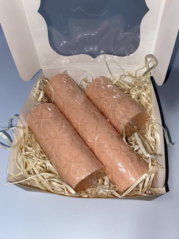 Коллекция свечей «Звездное небо» Декоративные свечи-цилиндры с рельефным узором ручной работы в нежном персиковом оттенке с узором звезд и приятным ароматом Доступны в трех размерах: Большая – для яркого акцента в интерьере (Высота – 175 мм; Диаметр – 45 мм; Вага свічки – 230 г.) Средний – универсальный вариант для любой комнаты (Высота – 112 мм; Диаметр – 45 мм; Вага свічки – 148 г.) Мини – компактная и нежная деталь уюта (Высота – 82 мм; Диаметр – 45 мм; Вага свічки – 104 г.) Идеально для гармоничного декора или подарка Добавьте чуточку магии «Звездного неба» в свой дом Можно изготовить в последующих цветах: зеленый, синий, фиолетовый, сиреневый, оранжевый, коричневый, серый, мятный, красный, сиреневый, рубиновый. Имеющиеся ароматы 1. Рождественский очаг (CandleScience Christmas Hearth) Ноти аромату Верхние ноты: Корица, имбирь, Апельсиновая цедра Средние ноты: гвоздика, кипарис База: Сосна, Пихта Классический праздничный аромат, рассказывающий историю уютной праздничной ночи, проведенный за бокалом вина перед камином. Ароматическое масло «Розовое очаг» сочетает в себе апельсиновые пряные ноты кухни, пихты и сосновые ноты рождественской елки и земляный дым от камина. Это канун Рождества в бутылке, доступный в любое время. Этот аромат наполнен натуральными эфирными маслами, включая апельсин, корицу, гвоздику, ветивер и сосна. 2. Морозный можжевельник (CandleScience Frosted Juniper) Ноти аромату Верхние ноты: Озон, Камфора, Цитрусы Средние ноты: Груша, Сосна, Красная смородина, Ягода, Вишневый цвет База: можжевельник, шалфей Ароматическое масло Frosted Juniper представляет собой волшебную смесь свежих вечнозеленых растений и фруктов. Охлаждающая камфора, воздушный озон и намек на цитрусовые начинают этот сложный зимний аромат. Средние ноты темно-красных ягод уравновешивают древесные ноты сосны и можжевельника. Свежие нотки вечнозеленых растений усиливаются эфирными маслами эвкалипта, хвои и листьев кедра. Свечи и смеси с этим классическим праздничным ароматом создают теплую и ностальгическую атмосферу. Этот аромат наполнен эфирными маслами, включая эвкалипт, хвою пихты, лимон, кедровые листья, гвоздичный лист и гальбанум. 3. Печенье (CandleScience Snickerdodle) Ноти аромату Верхние ноты: корица, сахар Средние ноты: масло, мед База: ваниль, сливки Вкусное лакомство с характерной потрескавшейся поверхностью и коричнево-сахарным вкусом, печенье Snickerdodle является целорической классикой. В соответствии с сердцем этих легких и вкусных блюд, ароматическое масло Snickerdodle имеет ноты сахара, корицы, меда и масла, скругленные гладкой сливочной ванилью. Этот аромат наполнен натуральными эфирными маслами, в том числе маслом даваны и маслом пачули. 4. Коньячна груша (CandleScience Brandied Pear) Ноти аромату Верхние ноты: корица, гвоздика Средние ноты: груша, яблоко, яблочный сидр База: сахар, бренди Brandied Pear – это классика CandleScience. Этот аромат представляет собой сладкое наслаждение спелой грушей и бренди, выдержанным в бочках. 5. Арктический плющ (CandleScience Arctic Ivy) Ноти аромату Верхние ноты: Эвкалипт, Бергамот, Лимон, Шалфей Средние ноты: Камфора, инжир, роза, зеленые листья База: Амбра, Мускус Подобно замысловатым кристаллическим узорам снежинок, ароматическое масло Арктического плюща ослепляет своим нежным, но сложным ароматом. Мерцающие верхние ноты эвкалипта и шалфея смешиваются с лимоном и бергамотом, создавая све