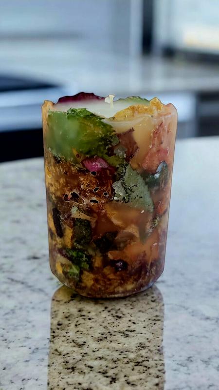 Свеча разноцветная, с сухоцветами - 35 часов горения, с ароматом апельсин в шоколаде
