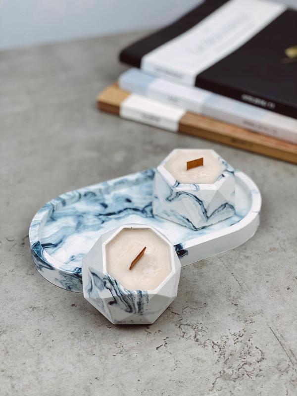 Набор ароматических соевых свечей в гипсовых кашпо mini в технике marble на подставке citr...