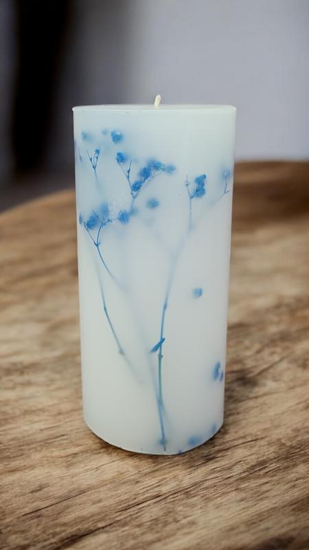 Цветок неба – свеча с голубой гипсофилой – 50 часов горения, с ароматом хлопок