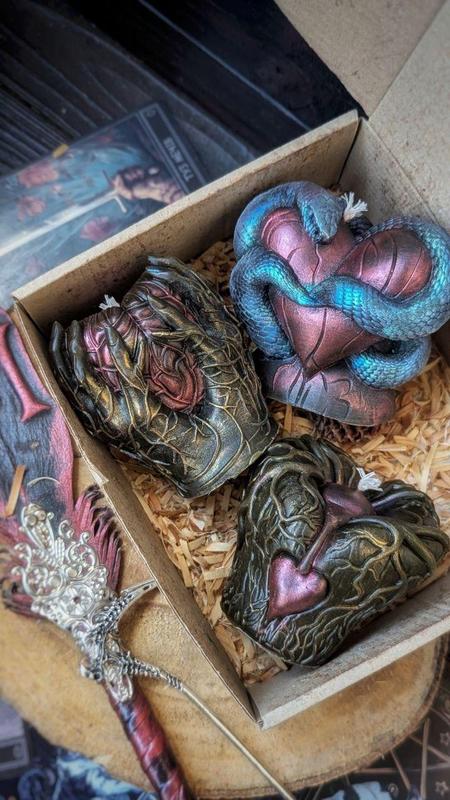 Набір з 3 свічок з натурального бджолиного воску у вигляді варіацій сердець, але у темному виконанні.