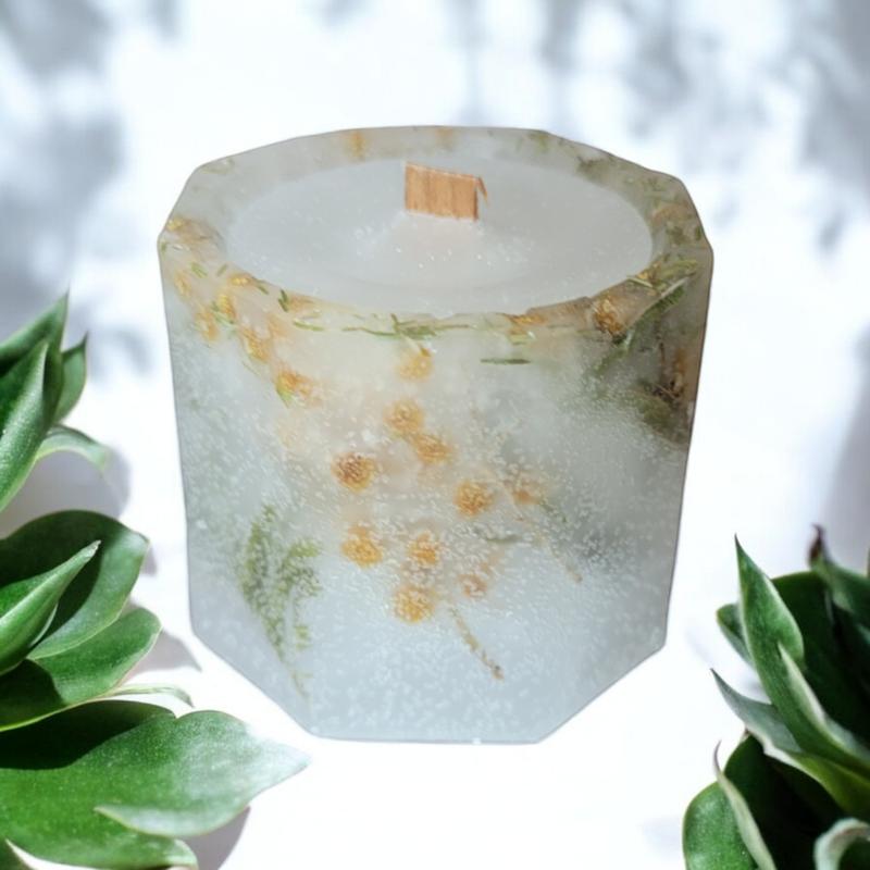 Восьмиугольная свеча с мимозой и деревянным фитилем, с ароматом лесные ягоды