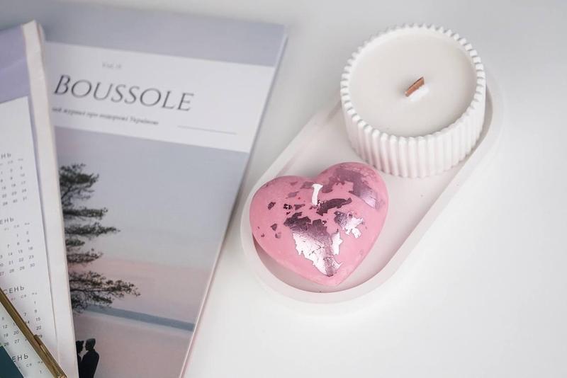 Аромасвеча сердце из соевого воска с декором со свечей в гипсовом кашпо на подставке ручно...