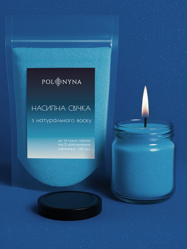 Насыпная свеча в баночке из пальмового воска голубая без аромата, с фитилем и держателем н...