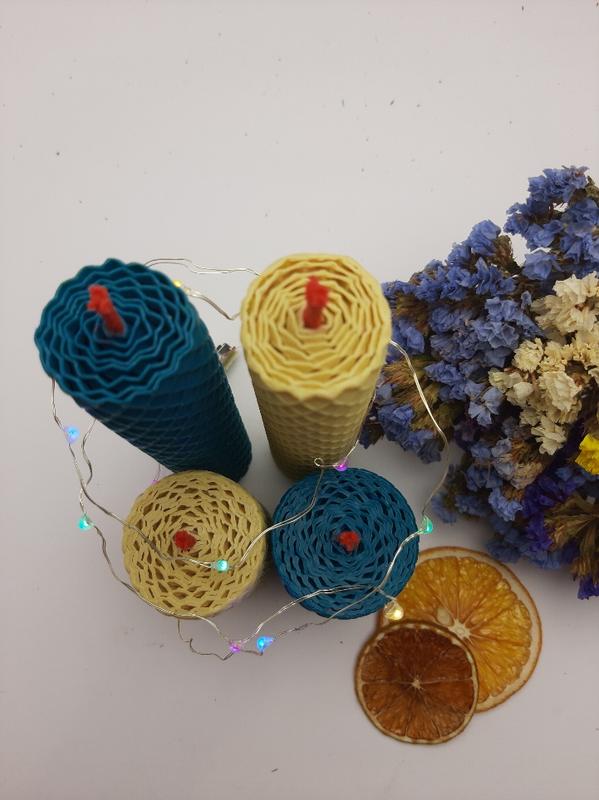 Ручная работа! Набор из 4 цветных сотовых свечей из пчелиного воска. Горящие свечи наполнят ваш дом чудесным ароматом натурального меда. НАБОР ИЗ 2 ЦВЕТОВ: В состав свечи входит 100% натуральный пчелиный воск. Никаких ароматизаторов. Размер свечи: 2шт - 13 см высота, 3 см диаметр 2шт - 6.5 см высота, 4 см диаметр. Свечи упакованы в прочную коробку, в коробке - цветной наполнитель - чтобы гарантировать качественную доставку товара. ВНИМАНИЕ !!! Не оставляйте горящую свечу без присмотра. Обязательно снимите декор, прежде чем зажигать свечи!