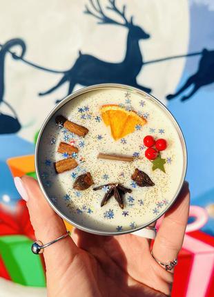 Святкові соєві свічки, з дерев'яним гнотом з потріскуванням, як біля багаття або каміна. Горя більше 35-ть годин поступово віддаючи аромат і наповнюючи їм простір. У складі 100% соєвий віск, 220 грамів з натуральними арома маслами хвоя, апельсин, мандарин, іланг-іланг, аніс, і кориця. Кожну свічку пакуєм в коробочку, у Вас буде повноцінний подарунок для рідних і близьких