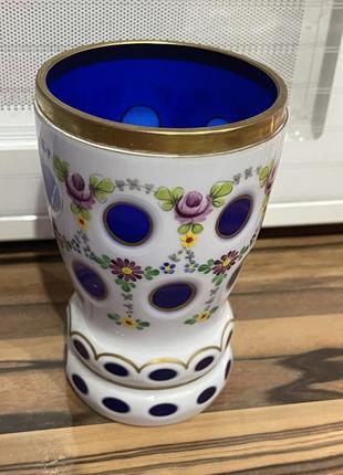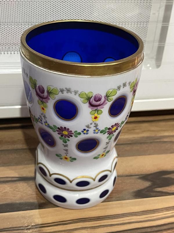 Подвійне скло, розпис емалями і позолотою. Дуже крута ваза 19 сторіччя, без втрат. Ймовірно Мозер. Ціна не маленька, але це та річ, яку залишають в спадок. Музейний рівень