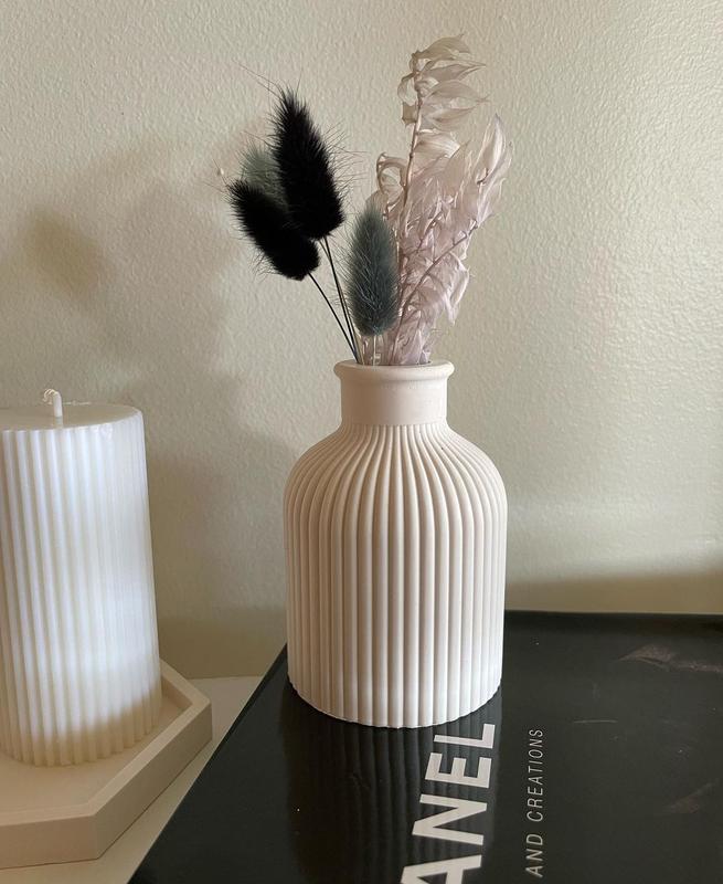 Ваза декоративна из гипса . Настоящая находка для перфекциониста и минималиста. Украсит ваш интерьер, идеально подходит для сухоцветов. Размеры : высота 10 см диаметр 6.8 см , горлышко 2.1 см Цвет белый, бежевый Цвет изделия может немного отличаться от фото