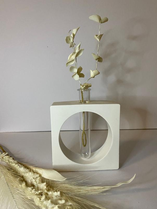 Ваза в стиле минимализм квадратная . Прекрасная деталь интерьера. Если ты любишь эстетику и предпочитаешь минимализм. Ваза подойдёт в качестве подарка . Украсит собой любое пространство. Идеальное сочетание с сухоцветами и живыми цветами. Материал гипс. цена вазы без колбы 180 грн колба +50 грн Высота основания 11 см Ширина основания 11 см Цвет : белый