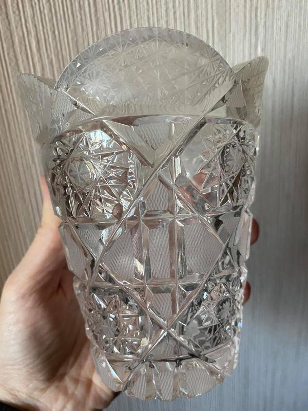 Новая, в упаковочной бумаге, без дефектов! Хрусталь с матовым напылением. Тяжелая, не будет переворачиваться. Не большая: высота - 13,5см, диаметр по верху - 11см/по низу - около 7см.