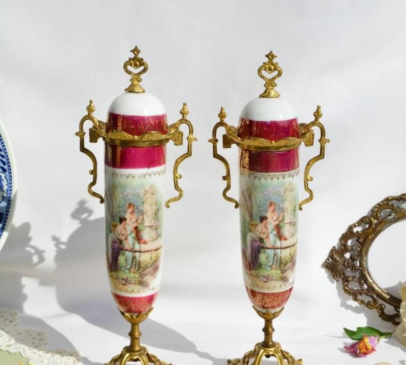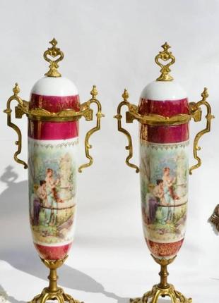 Роскошые РЕДКИЕ французские вазы в стиле SEVRES! Необычайно красивые парные сюжетные вазы на ножках. 19 век, Франция. Полностью авторские изделия ручной работы. Аналогичные изделия выпускались на Севрской Королевской фарфоровой мануфактуре (Севр Sevres). Оригинальная форма ваз, сложный ручной выпуклый декор 24-х каратной позолотой, фигурные ручки. Хорошее антикварное состояние предметов - без сколов и трещин, в качестве следов времени имеются потертости позолоты. Эти шикарные вазы станут достойным украшением Вашего дома или жемчужиной Вашей коллекции антикварного фарфора. Прекрасный подарок на юбилей, день рождения, и другие праздники.