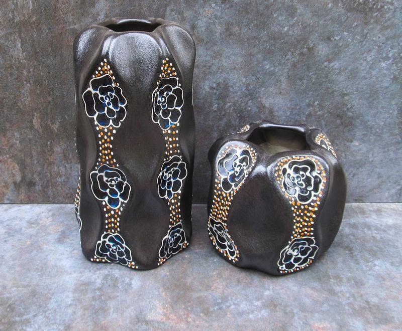 Керамические вазы ручной работы. Глина, литье, роспись глазурями . Высота большей 29 см, диаметр 16 см..высота меньшего 15 см, диаметр 16 см