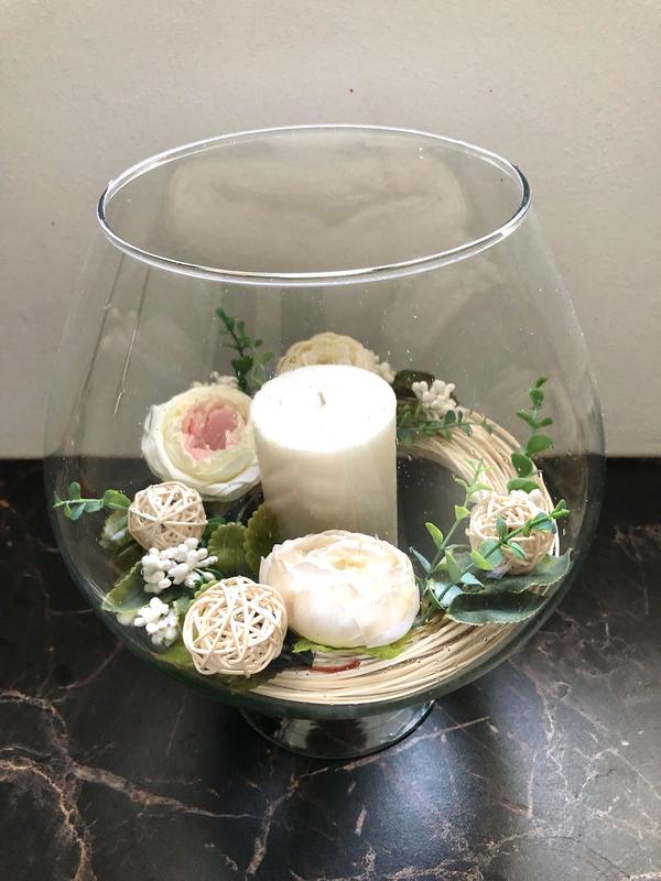 Декор в комнату, для создания уютной атмосферы. Ваза «коньяк» (d=14 см, h=25 см), внутри искусственные цветы, ротанг и свеча (d=6 см, h=10 см).Это станет красивым декором для вашего интерьера