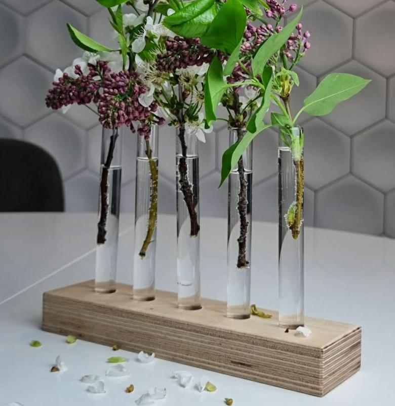 Эти стильные вазочки идеально подходят для придания элегантности и природной красоты к любому интерьеру. Набор состоит из пяти цилиндрических стеклянных ваз, каждая из которых содержит воду и различные виды цветов или веток. Вазочки установлены на прямоугольной деревянной основе с натуральным покрытием, что добавляет минималистичному дизайну естественный шарм. Этот набор вазочек станет отличным дополнением к вашему дому или офису, создавая атмосферу спокойствия и утонченности. Идеально подходит для подарка или для собственного использования, чтобы добавить немного зелени и свежести к вашему пространству.