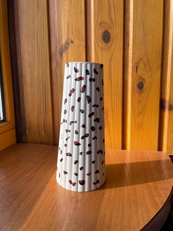 Элемент декора, идеально дополнит современное пространство. Ваза выглядит изысканно и стильно. Имеет оригинальный дизайн животного принта. Станет изюминкой помещения. Ребристая ваза небольшого размера украсит стол, полку или подоконник. Аксессуар можно наполнить искусственными цветами, сухоцветами, цветами из бисера, композициями из перьев и т.д. Изготовлена из высокопрочного гипса, который не боится воды и внешних условий.